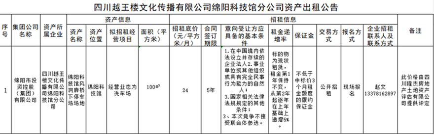 四川越王樓文化傳播有限公司綿陽(yáng)科技館分公司資產(chǎn)出租