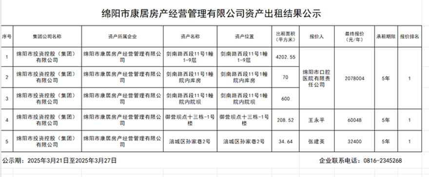 綿陽市康居房產(chǎn)經(jīng)營管理有限公司資產(chǎn)出租結(jié)果公示