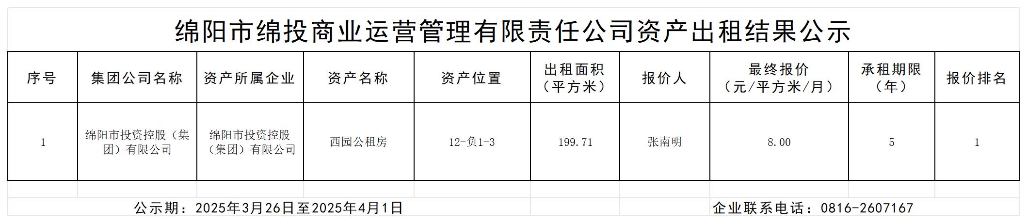 綿陽市綿投商業(yè)運營管理有限責(zé)任公司資產(chǎn)出租結(jié)果的公示
