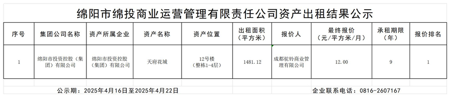綿陽市綿投商業(yè)運營管理有限責任公司資產(chǎn)出租結(jié)果公示