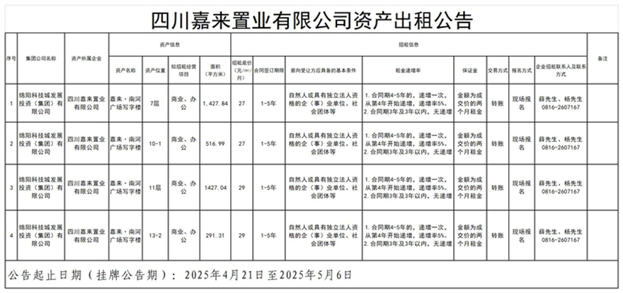 四川嘉來置業(yè)有限公司資產(chǎn)出租公告