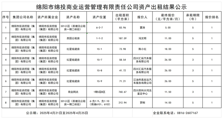 綿陽市綿投商業(yè)運(yùn)營(yíng)管理有限責(zé)任公司資產(chǎn)出租結(jié)果公示