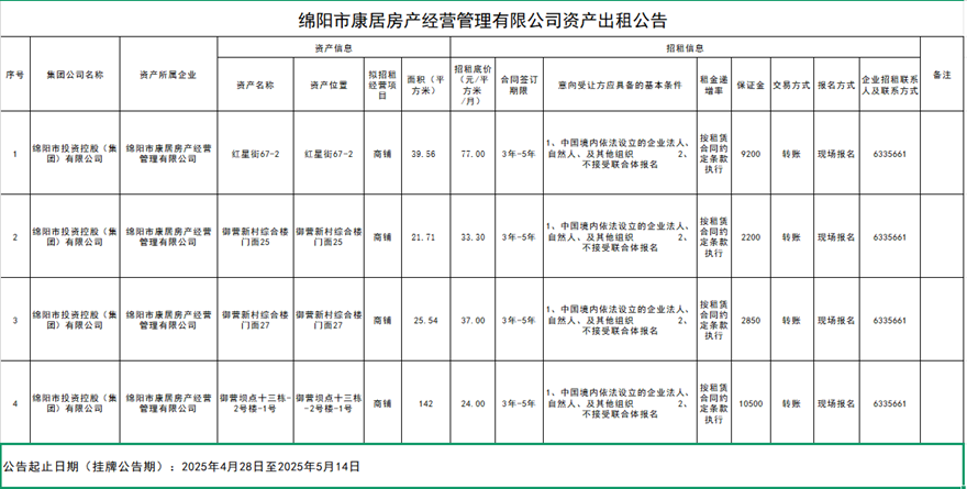 綿陽市康居房產(chǎn)經(jīng)營管理有限公司資產(chǎn)出租公告