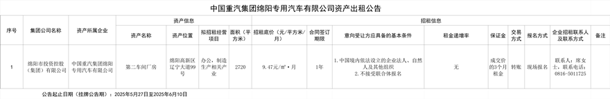 中國(guó)重汽集團(tuán)綿陽(yáng)專用汽車有限公司資產(chǎn)出租公告
