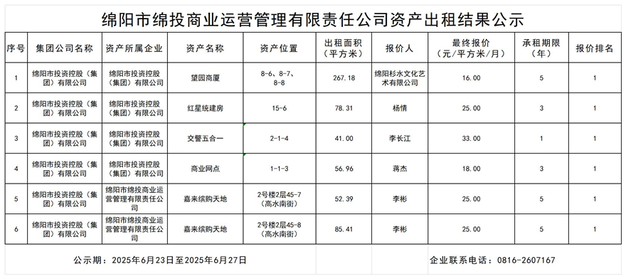 綿陽市綿投商業(yè)運(yùn)營管理有限責(zé)任公司資產(chǎn)出租結(jié)果公示