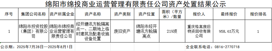 綿陽市綿投商業(yè)運營管理有限責任公司資產(chǎn)處置結(jié)果公示