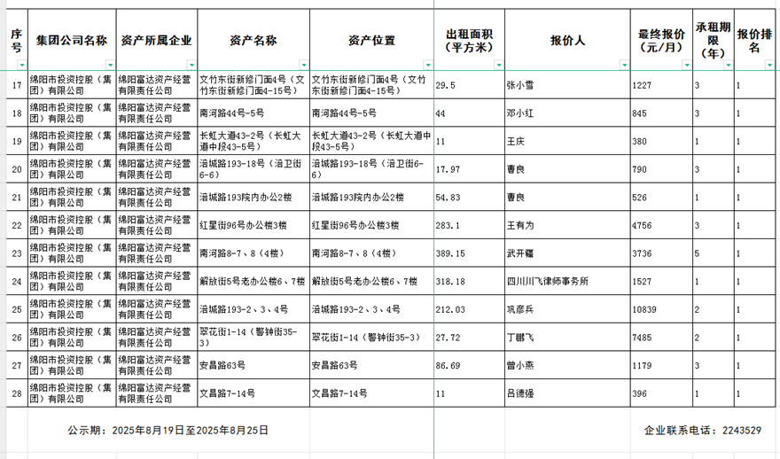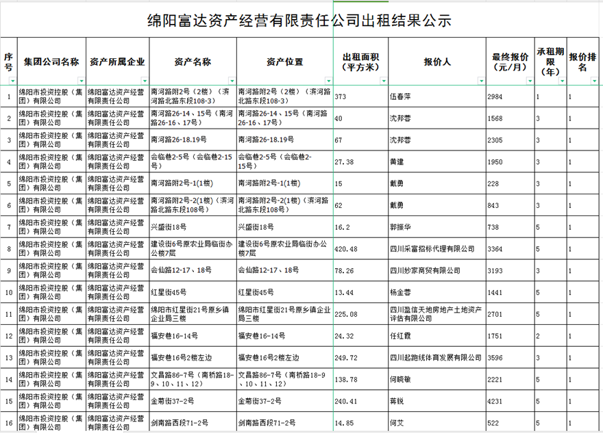 綿陽富達(dá)資產(chǎn)經(jīng)營有限責(zé)任公司出租結(jié)果公示