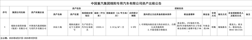 中國(guó)重汽集團(tuán)綿陽(yáng)專用汽車(chē)有限公司資產(chǎn)出租公告
