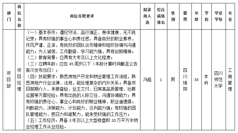 根據(jù)綿陽市康來物業(yè)服務(wù)有限公司發(fā)布的招聘公告及招聘相關(guān)規(guī)定,經(jīng)筆試、面試、背景調(diào)查等程序,擬錄用馮超同志到綿陽市康來物業(yè)服務(wù)有限公司項目部工作,現(xiàn)予以公示,具體情況如下: