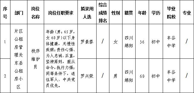 根據(jù)康居公司發(fā)布的長期招聘一線勤雜人員的招聘公告相關規(guī)定,經(jīng)面試、體檢等程序,擬錄用羅素蓉、羅興榮同志到綿陽市康居房產(chǎn)經(jīng)營管理有限公司片區(qū)公租房管理處東岳公租房小區(qū)工作,現(xiàn)予以公示,具體情況如下: