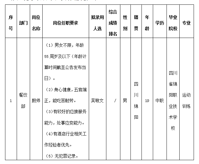 根據(jù)綿陽市東津酒店管理有限責任公司發(fā)布的招聘公告及招聘相關規(guī)定,通過面試等程序,擬錄用吳敬文同志到餐飲部工作,現(xiàn)予以公示,具體情況如下: