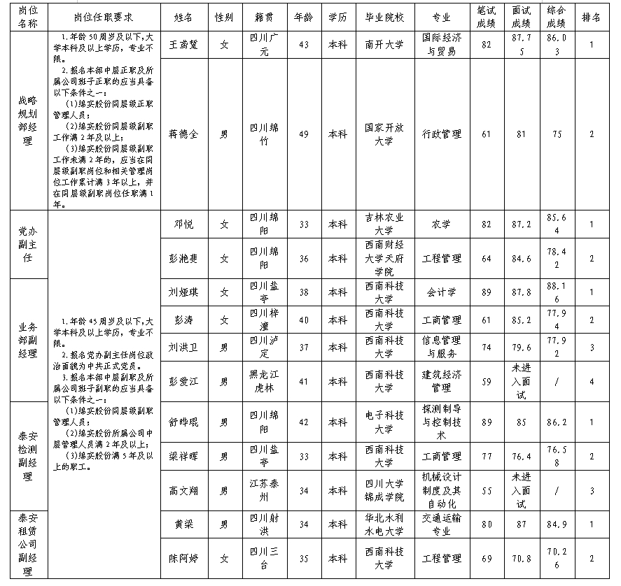 根據(jù)綿陽市汽車實(shí)驗(yàn)駕駛技術(shù)學(xué)校股份有限公司發(fā)布的內(nèi)部競聘公告及內(nèi)部競聘相關(guān)規(guī)定,經(jīng)筆試、面試等程序,現(xiàn)將內(nèi)部競聘成績予以公示。