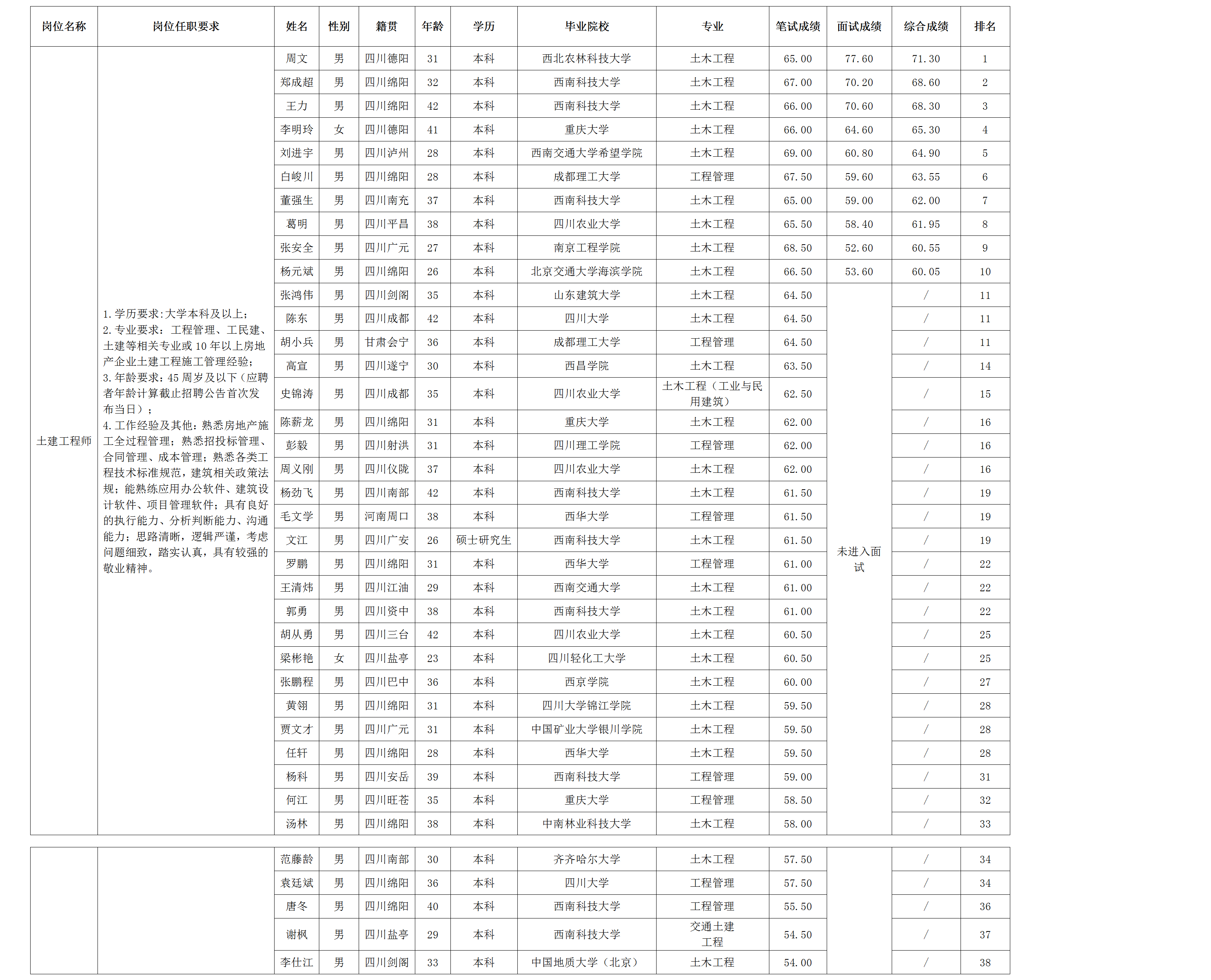 根據綿陽市綿投置地有限公司發(fā)布的招聘公告及招聘相關規(guī)定,經筆試、面試等程序,現(xiàn)將筆試、面試成績予以公示。