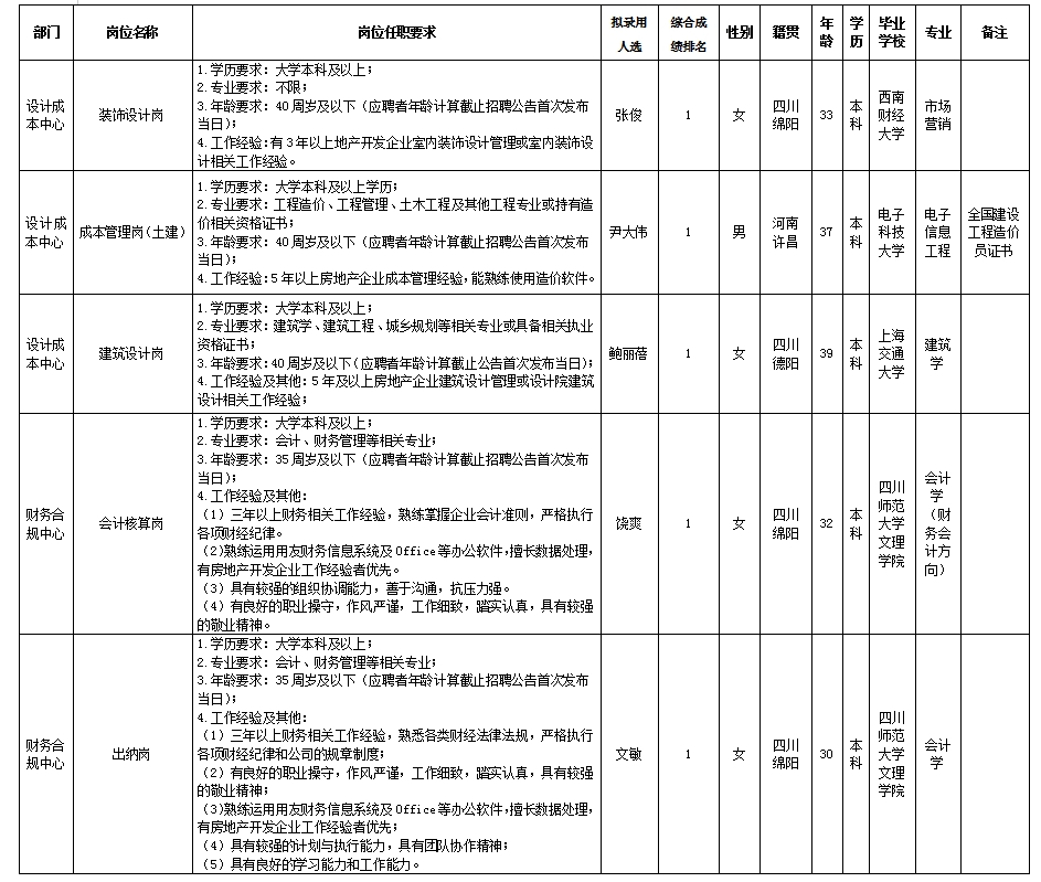 根據(jù)綿陽(yáng)市綿投置地有限公司發(fā)布的招聘公告及招聘相關(guān)規(guī)定,經(jīng)筆試、面試、考察、體檢等程序,擬錄用張俊等5名同志到綿陽(yáng)市綿投置地有限公司工作,現(xiàn)予以公示,具體情況如下:
