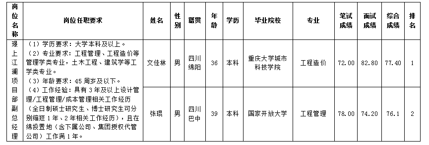 根據綿陽市綿投置地有限公司發(fā)布的招聘公告及招聘相關規(guī)定,經筆試、面試等程序,現將筆試、面試成績予以公示。