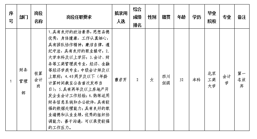 根據(jù)綿陽(yáng)市嘉遠(yuǎn)瑞華房地產(chǎn)開(kāi)發(fā)有限公司發(fā)布的招聘公告及招聘相關(guān)規(guī)定,經(jīng)筆試、面試、考察、體檢等程序,擬錄用曹彥芹同志到核算會(huì)計(jì)崗工作,現(xiàn)予以公示,具體情況如下: