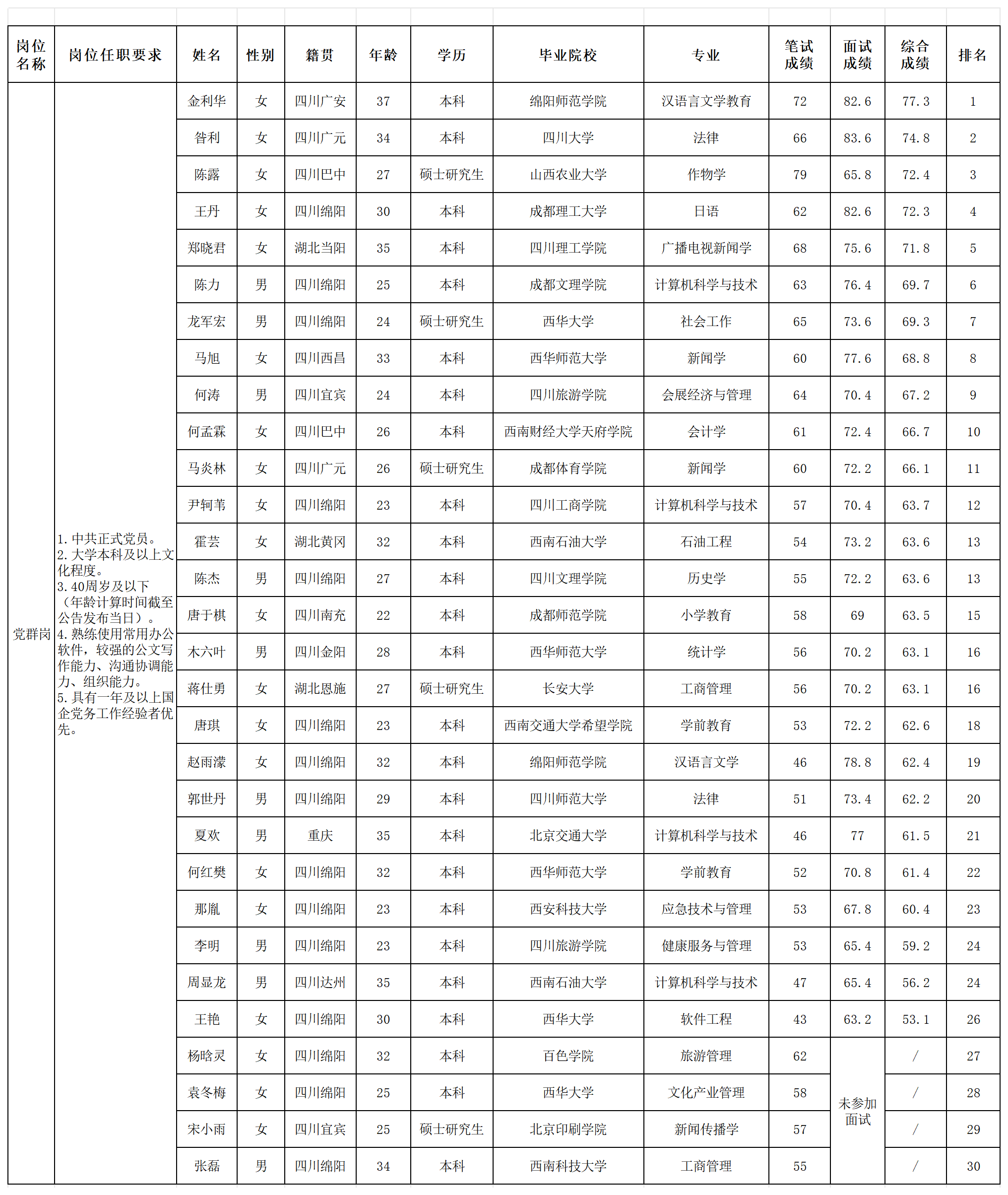 根據(jù)四川越王樓文化傳播有限公司發(fā)布的招聘公告及招聘相關(guān)規(guī)定,經(jīng)筆試、面試等程序,現(xiàn)將筆試(面試)成績(jī)予以公示。