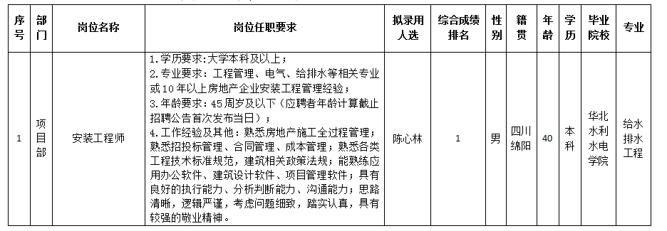 根據(jù)綿陽市綿投置地有限公司發(fā)布的招聘公告及招聘相關(guān)規(guī)定,經(jīng)筆試、面試、考察、體檢等程序,擬錄用陳心林同志到綿陽市綿投置地有限公司工作,現(xiàn)予以公示,具體情況如下: