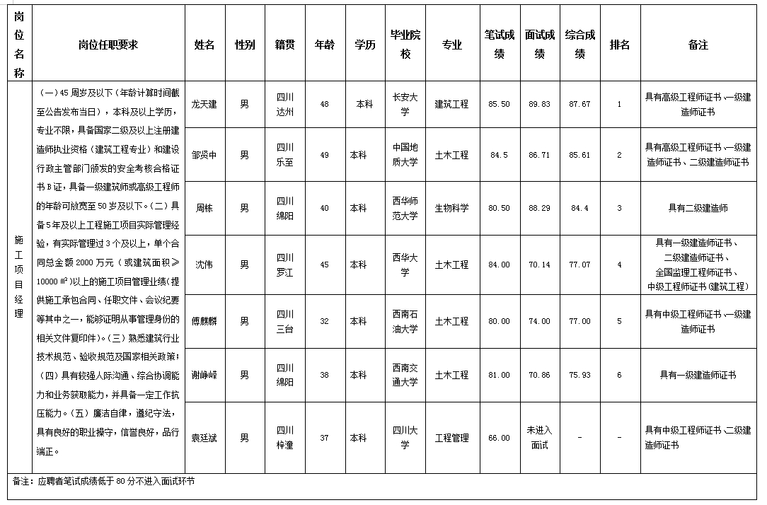 根據(jù)四川嘉來(lái)建筑工程有限公司發(fā)布的關(guān)于招聘施工項(xiàng)目經(jīng)理崗位的公告及招聘相關(guān)規(guī)定,經(jīng)筆試、面試等程序,現(xiàn)將筆試(面試)成績(jī)予以公示。