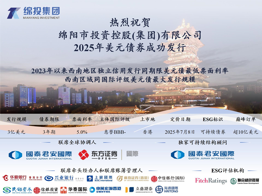 7月8日,綿投集團(tuán)成功定價(jià)發(fā)行3億美元、3年期可持續(xù)美元債券,認(rèn)購倍數(shù)3.43倍(峰值訂單超10億美元),最終票面利率強(qiáng)勢鎖定5.00%,較初始價(jià)格指引大幅收窄70個(gè)基點(diǎn),創(chuàng)2023年以來西南地區(qū)獨(dú)立信用發(fā)行同期限境外美元債最低票面利率、西南區(qū)域同國際評級美元債最大發(fā)行規(guī)模,以及創(chuàng)2025年以來中資投資級地方國企美元債最大收窄幅度。