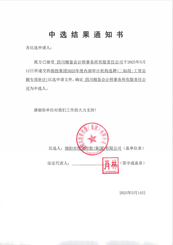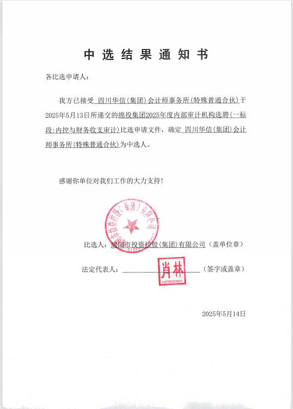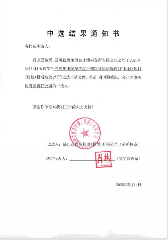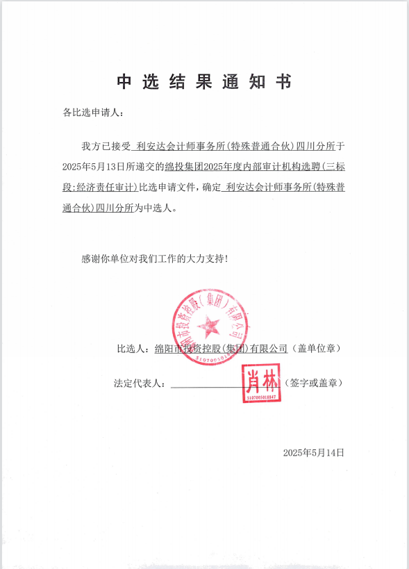 綿投集團2025年度內(nèi)部審計機構(gòu)選聘中選結(jié)果通知書