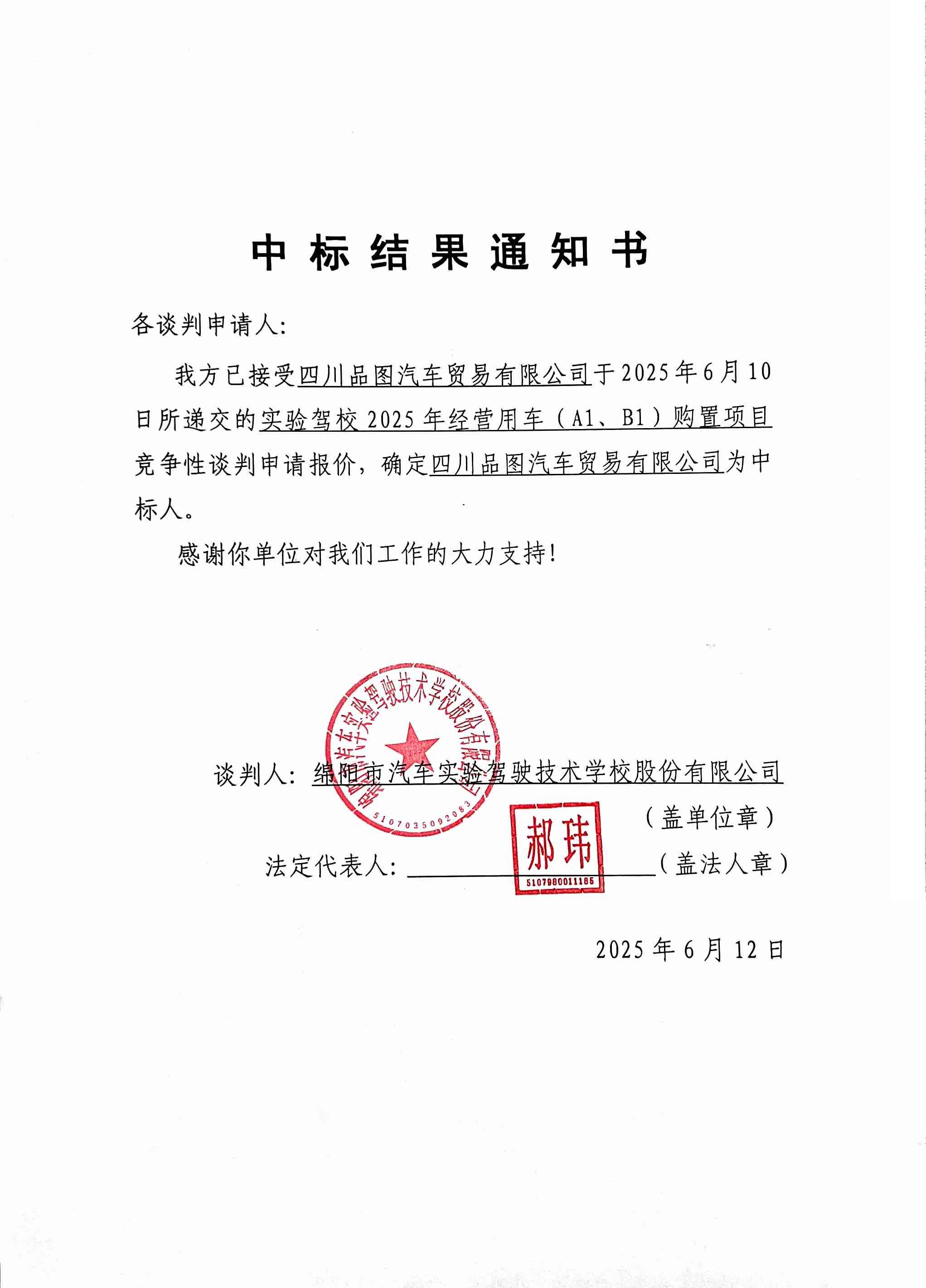 實(shí)驗(yàn)駕校2025年經(jīng)營(yíng)用車(A1、B1)購置項(xiàng)目中標(biāo)結(jié)果通知