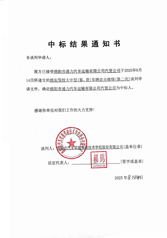 綿實(shí)駕校大中型(客、貨)車輛定點(diǎn)維修(第二次)中標(biāo)結(jié)果通知